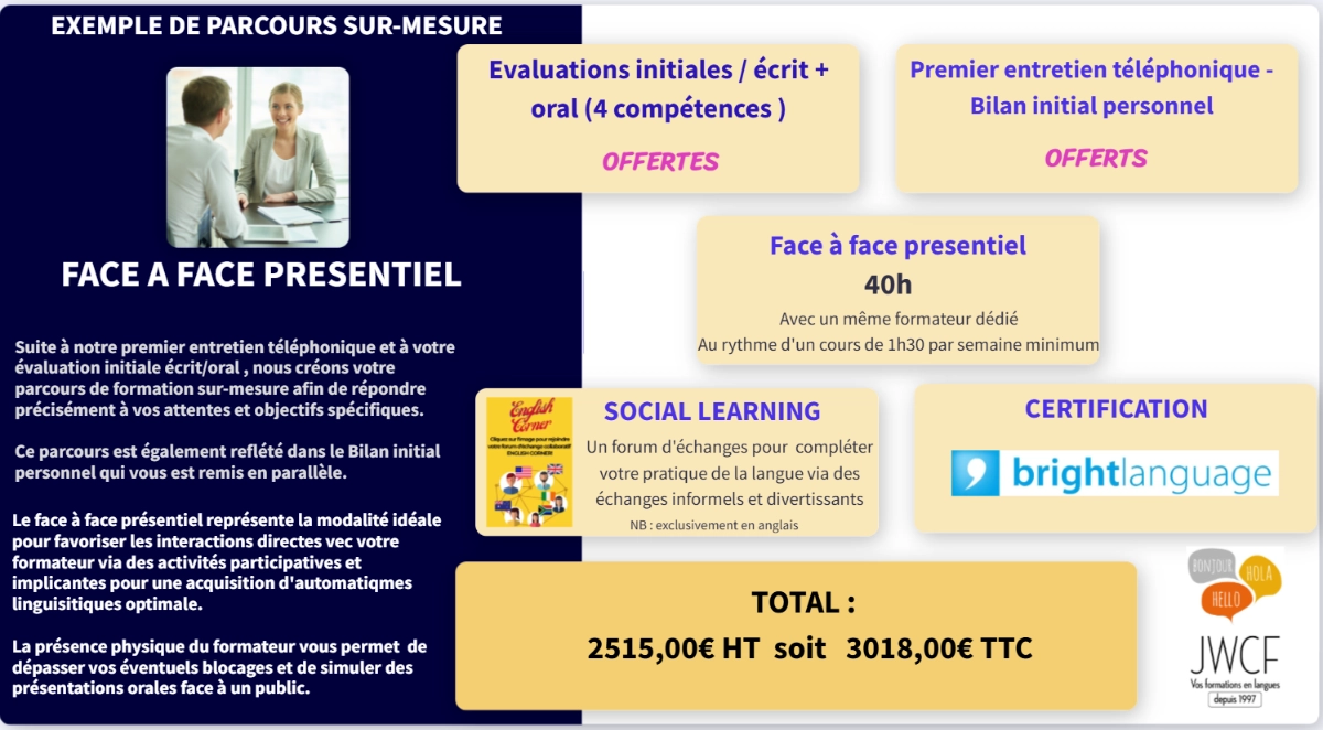 Evaluation gratuite de votre niveau (compréhensions + expressions écrites & orales) avant toute recommandation de formation personnalisée